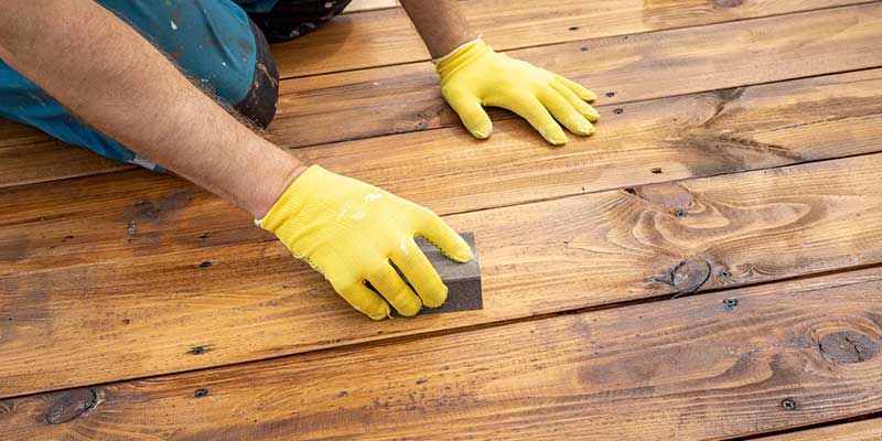Cleaning raises wood fibers; sanding knocks them flat so stain spreads evenly and paint flows without lap lines. Begin with sixty-grit on floorboards to remove raised grain, then transition to eighty-grit where boards meet to blur potential sander marks. Handrail caps benefit from one-hundred-twenty-grit to prevent splinters on gripping surfaces.